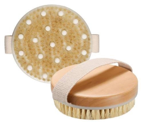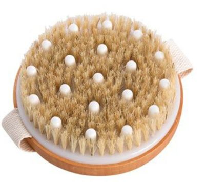 Our high quality body brush is made of beech wood handle and this is round shape with bristles and TPR tips which is soft and have massage function when you use it. Our round body brush can be used both in dry brush and when you take the shower.
