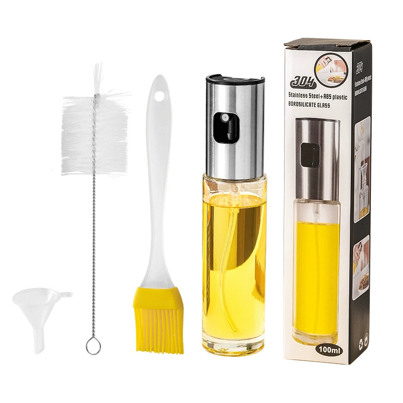 Buying oil sprayer in China from us, you will find this is good quality oil sprayer and it has 100ml volume. The press button has wavy shape, which has anti-slip function. When you use it to press, you can easy to put out oil. It can be used in kitchen, BBQ and outside. And in this set, you will also find more small useful accessories, include oil brush, used for brush oil on food; funnel, used for put oil in bottle; brush, used for clean the bottle. All are our useful items matching with our oil sprayer.